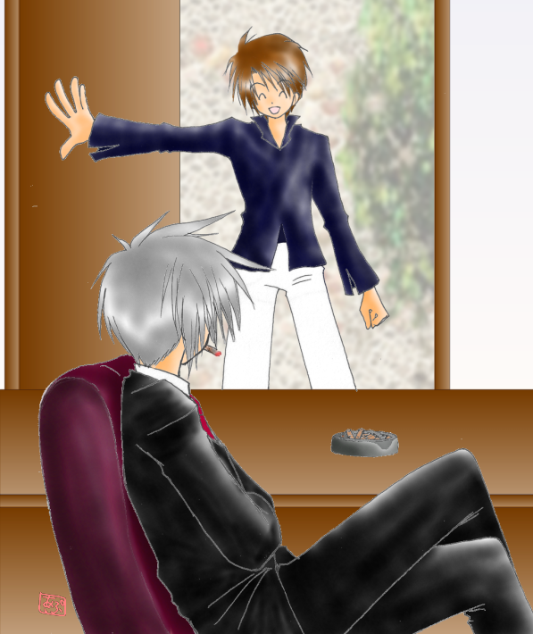 タバコの火をくわえて腕を組み、目を閉じている社長、おけな・・・。